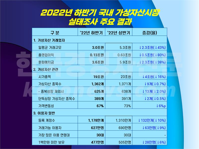 작년 하반기 국내 가상자산 시장은 시장 약세가 지속되면서 상반기 대비 시가총액, 거래규모, 영업이익 모두 크게 감소했다. 시가총액은 19조원으로 상반기 대비 16% 줄었고, 하루평균거래금액도 3조원으로 43% 감소했다. 가상자산사업자의 총영업이익은 1274억원으로 80% 하락했다.