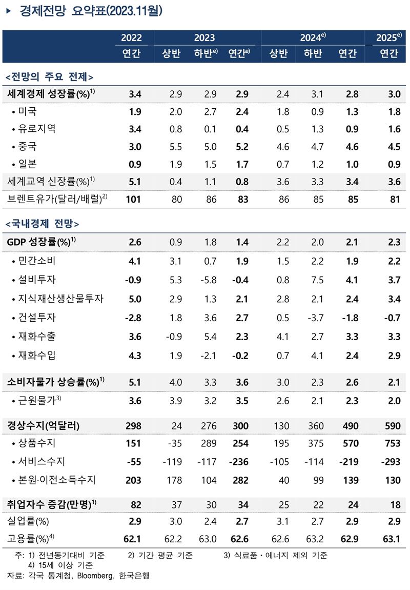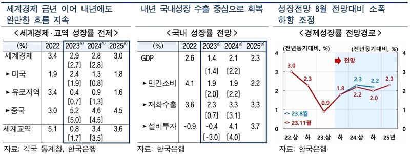 한국은행의 경제전망을 종합하면, 국내경기는 수출을 중심으로 개선흐름을 이어가고, 물가상승률은 비용인상압력의 영향으로 당초 예상보다는 다소 높아질 것으로 보이나 추세적으로는 둔화흐름이 이어질 전망이다. 경기는 반도체경기 반등에 힘입어 수출을 중심으로 점차 나아지겠으나 내수는 통화긴축의 영향 등으로 당초 예상보다는 더딘 회복흐름을 보일 것으로 전망된다. 물가는 전반적으로 둔화되고 있지만 상당기간 목표수준을 웃도는 물가오름세가 지속될 것으로 예상되는 만큼 물가 리스크에 계속 유의할 필요가 있다.