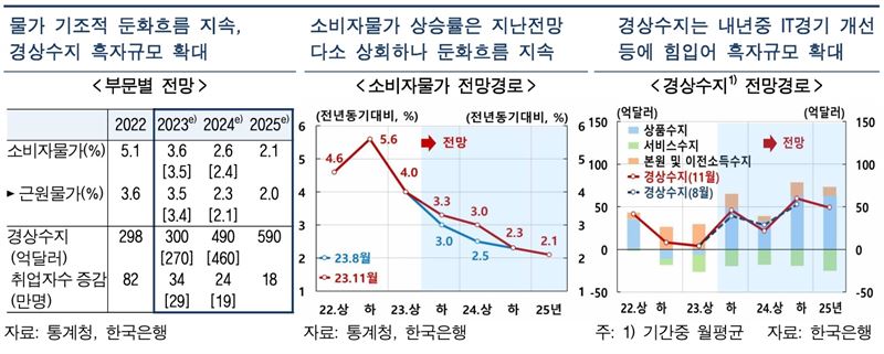 앞으로 둔화흐름(소비자물가 금년 3.6%→내년 2.6%, 근원물가 3.5%→2.3%)을 이어갈 것으로 보이나 금년(+0.1%p)과 내년(+0.2%p) 모두 지난 전망수준을 다소 상회할 것으로 예상했다.