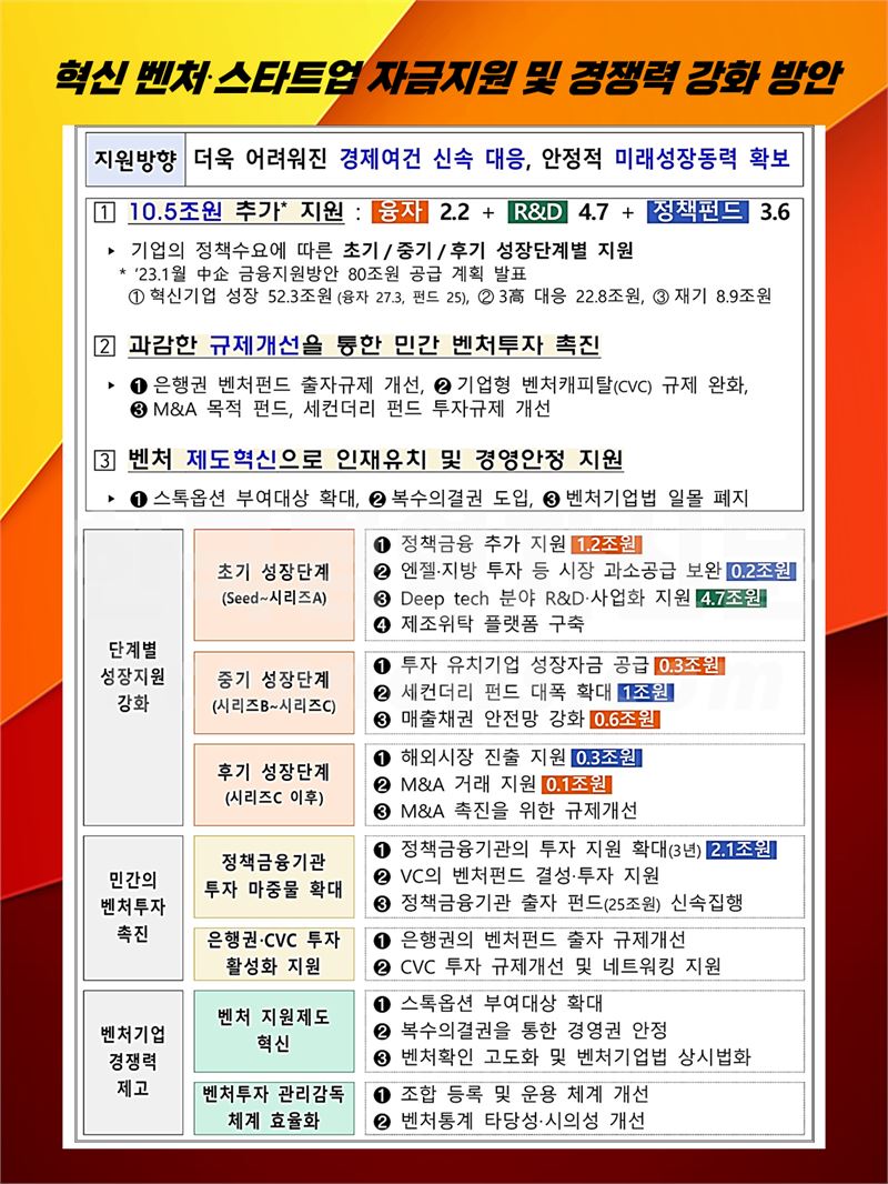 정부는 정책금융기관 등을 통한 성장단계별 지원강화에 총 10.5조원을 투입한다. 정책금융 2.2조원, 정책펀드 3.6조원, R&D 4.7조원 등이다.