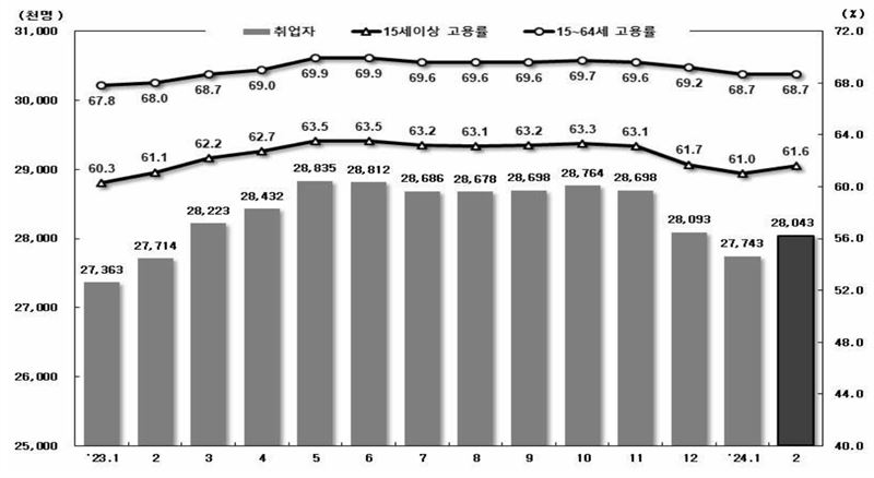 통계청은 지난 13일, 올 2월 고용동향을 발표했다. 15세이상 취업자는 2804만3천명으로 전년동월대비 32만9천명(1.2%) 증가했다.