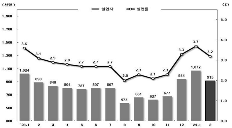 2월 실업자는 91만5천명으로 전년동월대비 2만5천명(2.8%) 증가했다. 성별로 보면 남자는 49만7천명으로 전년동월대비 2만9천명(6.3%) 증가했으나, 여자는 41만8천명으로 5천명(-1.1%) 감소했다.