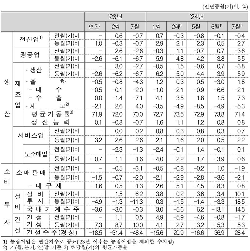기획재정부는 7월 산업활동은 생산 측면에서 서비스업(0.7%)이 상승하고, 공공행정이 한 달 만에 반등했으나, 건설업(-1.7%)이 감소하고 광공업(-3.6%)이 일시 조정되며 전산업 생산은 소폭 감소(-0.4%)했다고 분석했다.