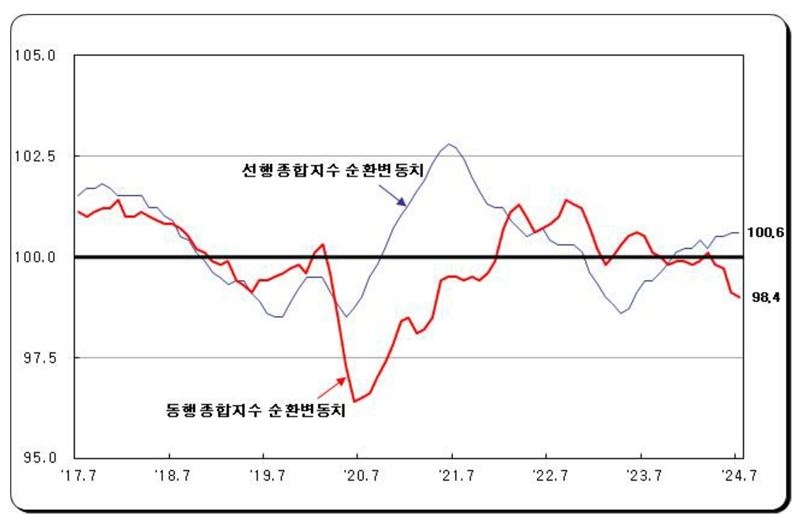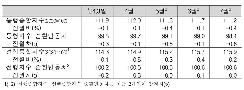 동행종합지수는 전월대비 -0.4%를 기록했다. 동행종합지수에서 추세요인을 제거해 현재의 경기상황을 보여주는 '동행종합지수 순환변동치'는 수입액이 증가하였으나, 내수출하지수, 건설기성액 등이 감소하여 전월대비 0.6p 하락했다.
