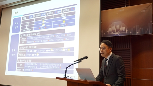 22일 금투센터에서 열린 '2025년 자본시장 전망과 주요 이슈' 세미나에서 장보성 거시금융실장이 발표하고 있다. 자본시장연구원제공