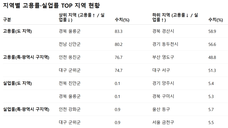 고용률 상위 지역으로는 경북 울릉군(83.3%), 전남 신안군(80.2%) 등이 꼽혔다. 반대로 경기 동두천시(56.6%), 경북 경산시(58.9%), 부산 영도구(48.8%)는 최하위권을 기록하며 도시·산업 구조적 한계를 드러냈다.