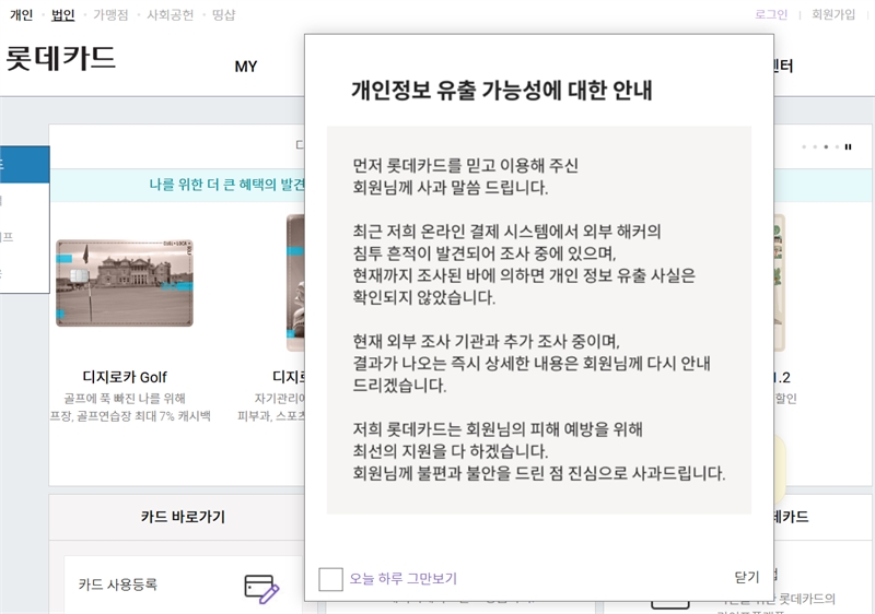롯데카드 측은 “외부 공격자가 온라인 결제 서버를 통해 자료 유출을 시도한 흔적을 발견해 즉각 차단했다”며 “현재까지 고객정보 등 주요 개인정보 유출은 확인되지 않았다”고 설명했다.
